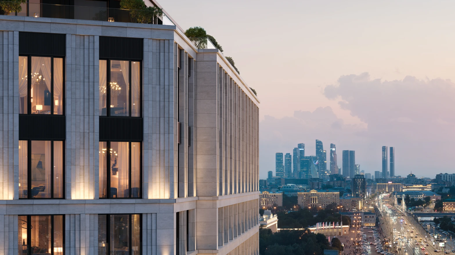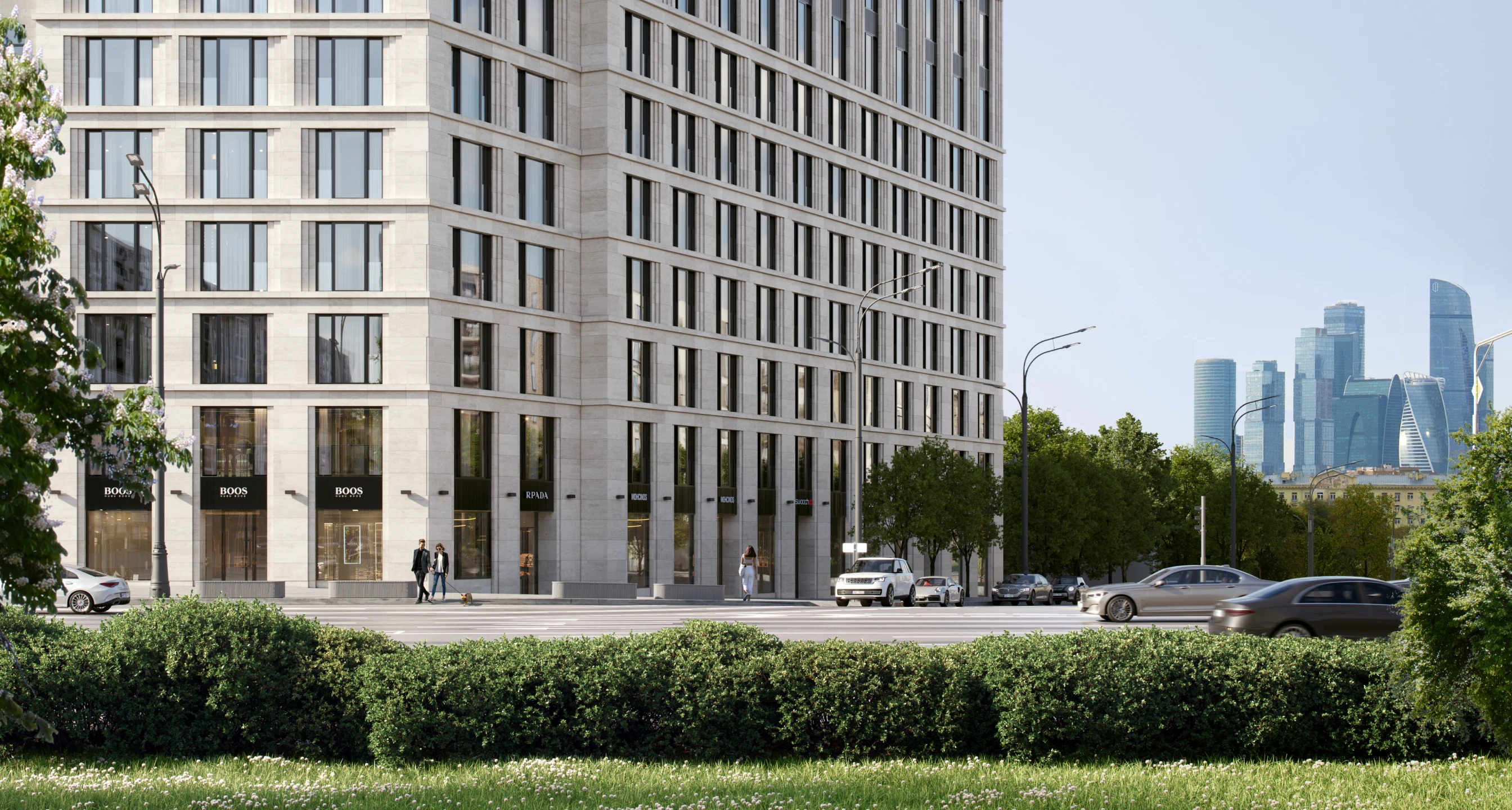 Особую тактильность и выразительность проекту придает облицовка светлым натуральным камнем из Португалии.
